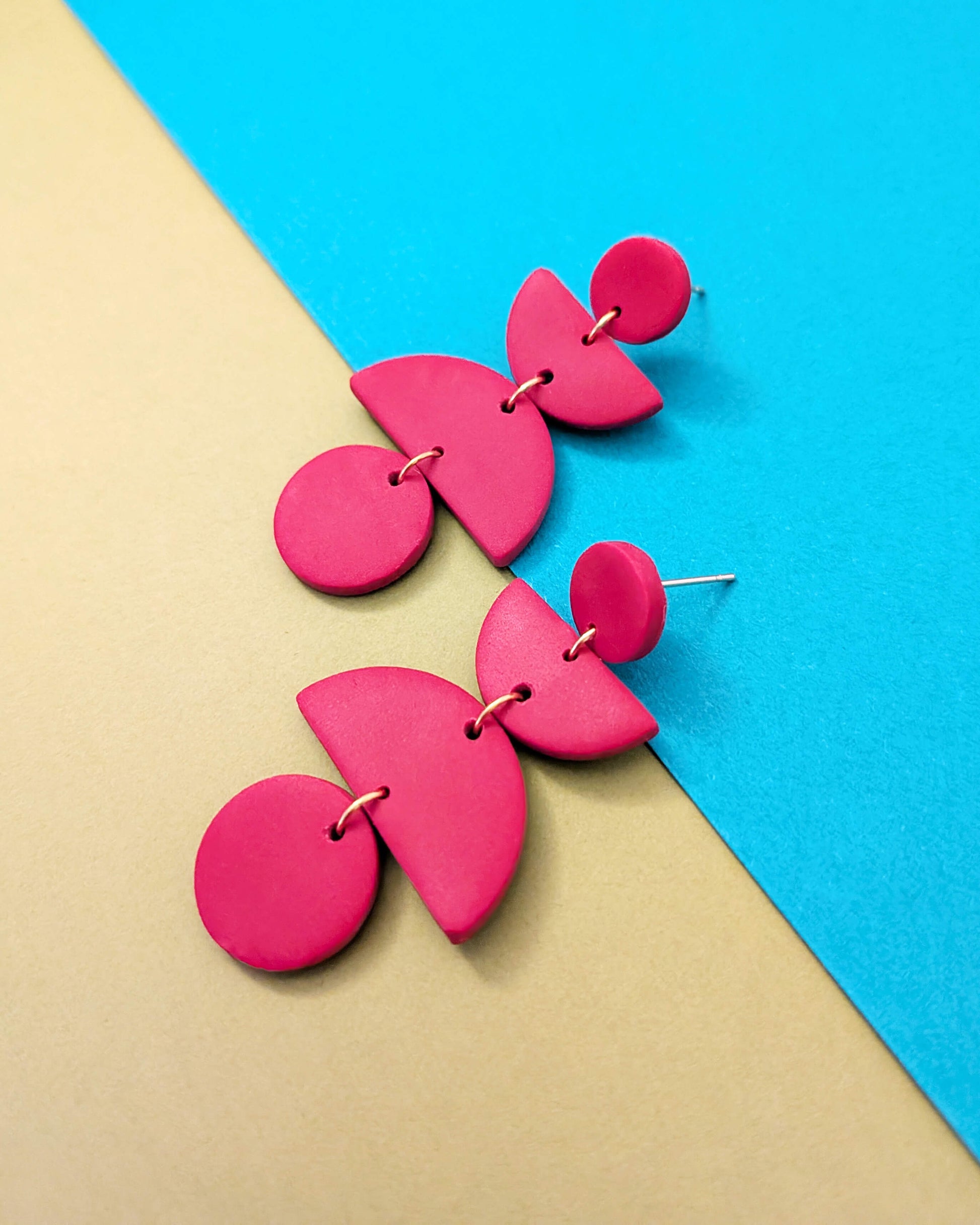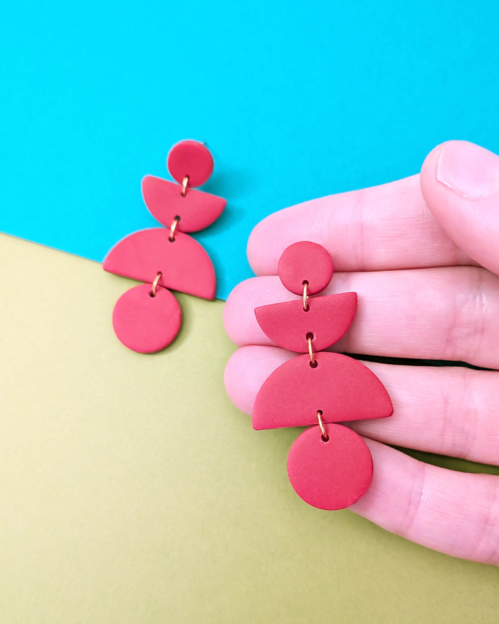 Deep red shapes of clay, combined to make a statement monochrome dangle style.